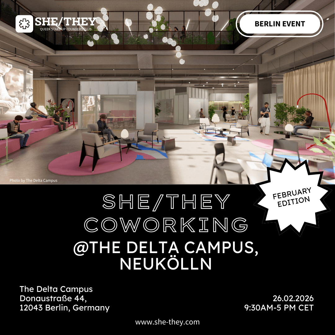 This is why Tinush created – of course with Gabi's and Letizia's support – the SHE/THEY Club, which is a safer space for queer women* and non-binary folks who are founders or are on their way to become one. Jil joined Tinush in 2024 and all the others afterwards. This club is all about empowerment, not division.